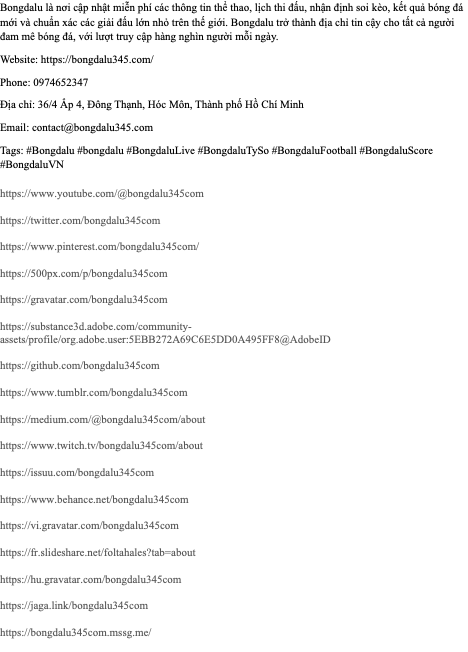 Bongdalu là nơi cập nhật miễn phí các thông tin thể thao, lịch thi đấu, nhận định soi kèo, kết quả bóng đá mới và chuẩn xác các giải đấu lớn nhỏ trên thế giới. Bongdalu trở thành địa chỉ tin cậy cho tất cả người đam mê bóng đá, với lượt truy cập hàng nghìn người mỗi ngày. Website: https://bongdalu345.com/ Phone: 0974652347 Địa chỉ: 36/4 Ấp 4, Đông Thạnh, Hóc Môn, Thành phố Hồ Chí Minh Email: contact@bongdalu345.com Tags: #Bongdalu #bongdalu #BongdaluLive #BongdaluTySo #BongdaluFootball #BongdaluScore #BongdaluVN https://www.youtube.com/@bongdalu345com https://twitter.com/bongdalu345com https://www.pinterest.com/bongdalu345com/ https://500px.com/p/bongdalu345com https://gravatar.com/bongdalu345com https://substance3d.adobe.com/community-assets/profile/org.adobe.user:5EBB272A69C6E5DD0A495FF8@AdobeID https://github.com/bongdalu345com https://www.tumblr.com/bongdalu345com https://medium.com/@bongdalu345com/about https://www.twitch.tv/bongdalu345com/about https://issuu.com/bongdalu345com https://www.behance.net/bongdalu345com https://vi.gravatar.com/bongdalu345com https://fr.slideshare.net/foltahales?tab=about https://hu.gravatar.com/bongdalu345com https://jaga.link/bongdalu345com https://bongdalu345com.mssg.me/ https://x.com/bongdalu345com https://solo.to/bongdalu345com https://profile.hatena.ne.jp/bongdalu345com/profile https://www.goodreads.com/user/show/199901147-bongdalu https://rapidapi.com/user/bongdalu345com https://www.tripadvisor.com/Profile/bongdalu345com https://disqus.com/by/bongdalu345com/about/ https://heylink.me/bongdalu345com/ https://pixabay.com/es/users/55212028/ https://md.opensourceecology.de/s/d0QGHnUHq https://subsequent-quokka-0a1.notion.site/BONGDALU-333dbfa0b0fb80b3b71fd50df1ed073d?pvs=73 https://www.slideshare.net/foltahales?tab=about https://bn.quora.com/profile/Bongdalu-16 https://hub.docker.com/u/bongdalu345com https://www.mixcloud.com/bongdalu345com/ https://fliphtml5.com/pt/home/uowrlv https://www.producthunt.com/@bongdalu345com https://www.divephotoguide.com/user/bongdalu345com/ https://giphy.com/channel/bongdalu345com https://www.notion.so/BONGDALU-333dbfa0b0fb80b3b71fd50df1ed073d https://www.walkscore.com/people/272910848155/bongdalu345com https://about.me/bongdal https://fairygodboss.com/users/profile/T0oDyJaL9X/go88iitcom https://bongdalu345com.mystrikingly.com/ https://www.renderosity.com/users/id:1842541 https://app.readthedocs.org/profiles/bongdalu345com/ https://doc.anagora.org/s/SNY_7iYVY https://te.legra.ph/Bongdalu--K%E1%BA%BFt-qu%E1%BA%A3-T%E1%BB%B7-l%E1%BB%87-k%C3%A8o-L%E1%BB%8Bch-thi-%C4%91%E1%BA%A5u-BXH--Nh%E1%BA%ADn-%C4%91%E1%BB%8Bnh-b%C3%B3ng-%C4%91%C3%A1---Bong-Da-Lu-03-29-2 https://www.zazzle.com/mbr/238704989328834338 https://flipboard.com/@bongdalu345com/bongdalu-gtbd52h2y https://www.awwwards.com/bongdalu345com/ https://band.us/band/102111508/post/1 https://destaquebrasil.com/saopaulo/author/bongdalu345com/ https://md.coredump.ch/s/lQshbYh3r https://camp-fire.jp/profile/bongdalu345com https://qna.habr.com/user/bongdalu345com https://qiita.com/bongdalu345com https://diigo.com/012880m https://vocal.media/authors/bongdalu345com https://letterboxd.com/bongdalu345com/ https://www.zazzle.com.au/mbr/238704989328834338 https://3dwarehouse.sketchup.com/by/bongdalu345com https://www.play56.net/home.php?mod=space&uid=6087162 https://lamsn.com/home.php?mod=space&uid=1912877 https://te.legra.ph/Bongdalu-03-29 https://booklog.jp/users/bongdalu345com/profile https://civitai.com/user/bongdalu345com https://www.betting-forum.com/members/bongdalu345com.152653/#about https://forum.tkool.jp/index.php?members/bongdalu345com.101982/#about https://pad.deckenpfronn.info/s/vzRTZDBiC https://profile.sampo.ru/bongdalu345com https://hypothes.is/users/bongdalu345com https://www.czporadna.cz/user/bongdalu345com https://akniga.org/profile/1406276-bongdalu https://motion-gallery.net/users/935709 https://pad.fablab-siegen.de/s/31J8MRU3j https://pad.libreon.fr/s/6sdgIRGrO https://www.stylevore.com/user/bongdalu345com https://boss.why3s.cc/boss/home.php?mod=space&uid=258852 https://cointr.ee/bongdalu345com https://hukukevi.net/user/bongdalu345com https://www.d-ushop.com/forum/topic/115062/bongdalu https://www.speedrun.com/users/bongdalu345com/about https://www.ttlxshipping.com/forum/topic/360795/bongdalu https://www.reddit.com/user/bongdalu345com/ https://hostndobezi.com/bongdalu345com http://mura.hitobashira.org/index.php?bongdalu345com https://bn.gravatar.com/bongdalu345com https://londonchinese.com/home.php?mod=space&uid=618381&do=profile https://fa.gravatar.com/bongdalu345com https://careers.coloradopublichealth.org/profiles/8081437-bongda-lu https://forum.aigato.vn/user/bongdalu345com https://www.zazzle.fr/mbr/238704989328834338 https://oye.participer.lyon.fr/profiles/bongdalu345com/activity https://www.bandlab.com/bongdalu345com https://www.buckeyescoop.com/users/cd4e24ac-d2ed-4a7e-832e-6de18b70a489 https://decidim.derechoaljuego.digital/profiles/bongdalu345com/activity https://www.zazzle.se/mbr/238704989328834338 https://www.tripadvisor.es/Profile/bongdalu345com https://md.opensourceecology.bangladhadha.com/load.php?note=abf106da https://fr.tripadvisor.be/Profile/bongdalu345com https://hedgedoc.bangladhadha.com/load.php?note=217616c0 https://www.notebook.ai/users/1317385 https://maxforlive.com/profile/user/bongdalu345com?tab=about https://pledgeme.co.nz/profiles/325906/ https://cf.slideshare.net/foltahales?tab=about https://hackaday.io/bongdalu345com https://pad.funkwhale.audio/s/JoWEEzKCY https://bookmeter.com/users/1700646 https://bongdalu345com.themedia.jp/posts/58694982 https://cornucopia.se/author/bongdalu345com/ https://www.grepmed.com/bongdalu345com https://forum.epicbrowser.com/profile.php?section=personal&id=146436 https://www.zophar.net/forums/index.php?members/bongdalu345com.132374/#about https://selficlub.com/bongdalu345com https://www.thepartyserv